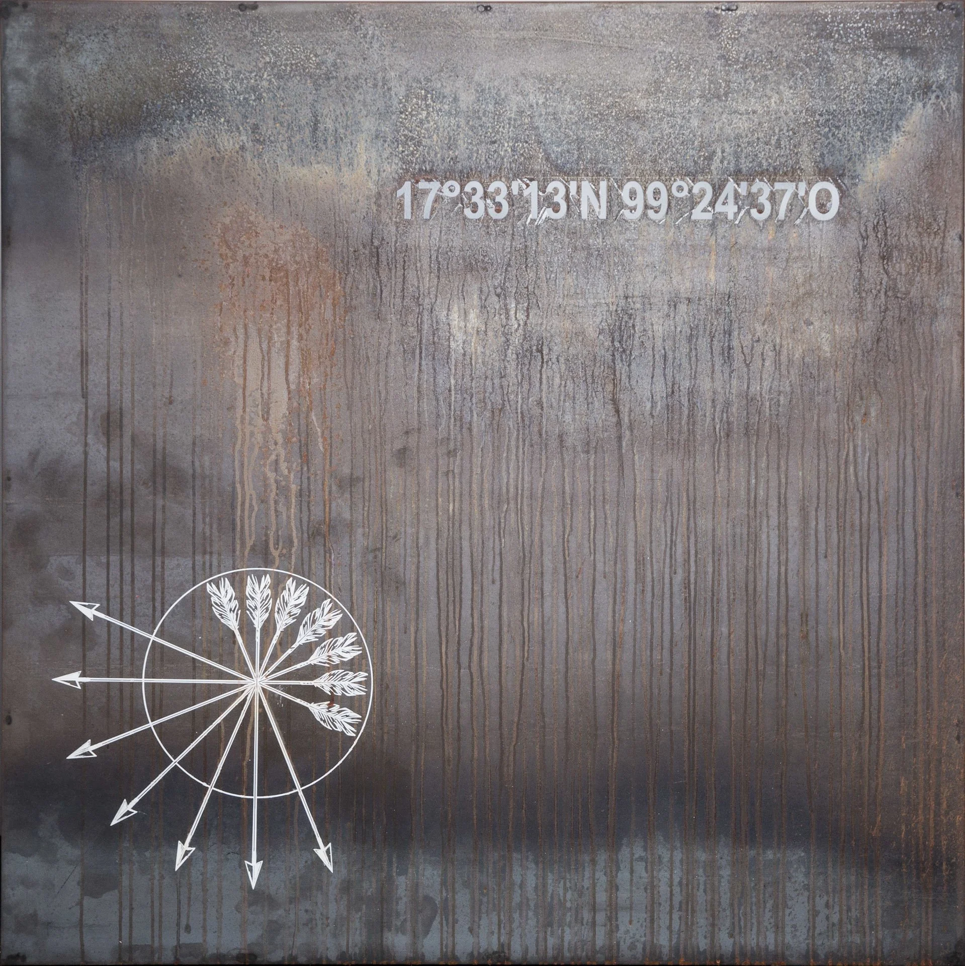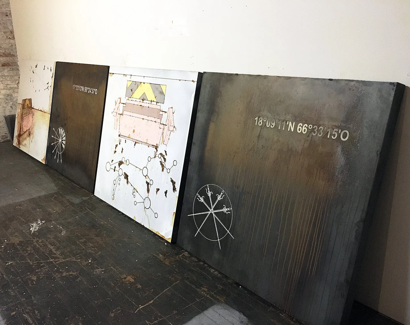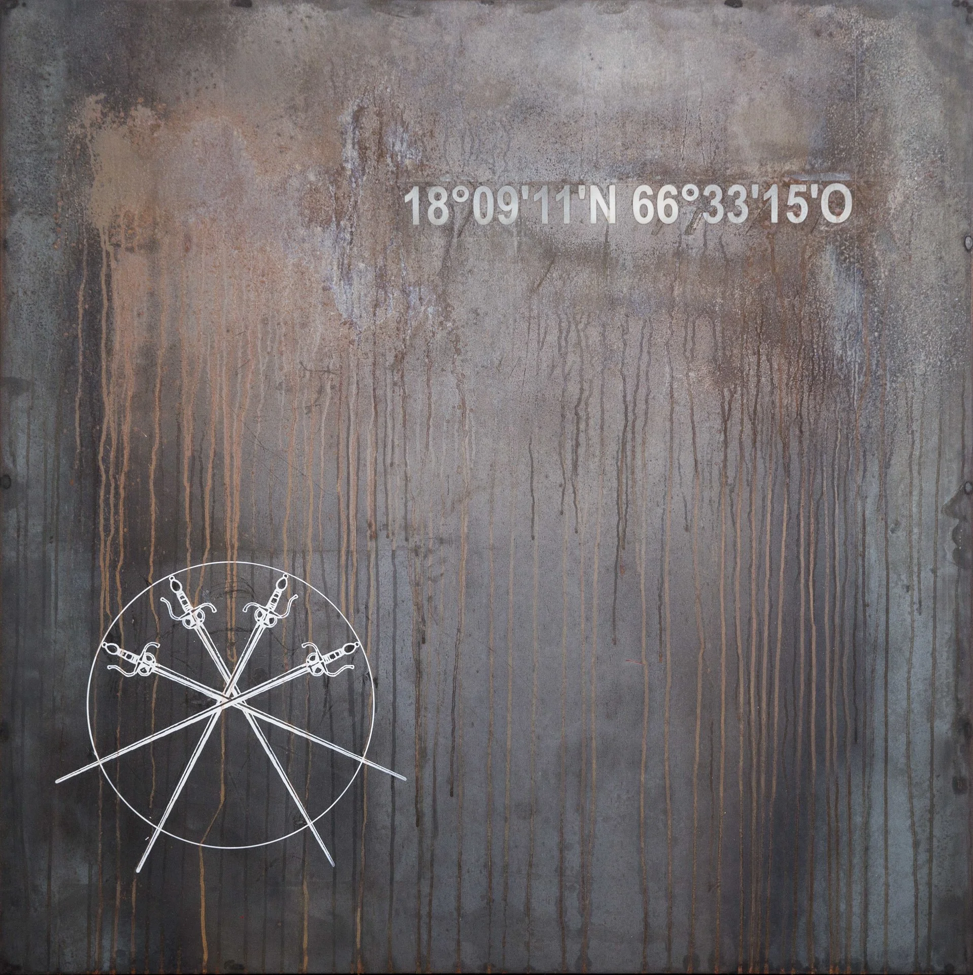 The work itself brings coordinates of specific places on which these historic events happened and connects them with a larger sense of repercussions via the use of constellations that mark the specific time at which such crimes happened. The use of rust and metal appeals to the use of violence in the context of industrialized society as well as speaks about the societal wounds that these events inflicted in the evolvement of the socio-political imaginary of two countries, Mexico and Puerto Rico. The series is a commentary on the assassination of 43 students in Mexico in 2014 (Ayotzinapa), which in many similar ways parallels the history of two students (Carlos Enrique Soto-Arriví and Arnaldo Darío Rosado-Torres), assassinated in Puerto Rico back in 1978 (Cerro Maravilla).
