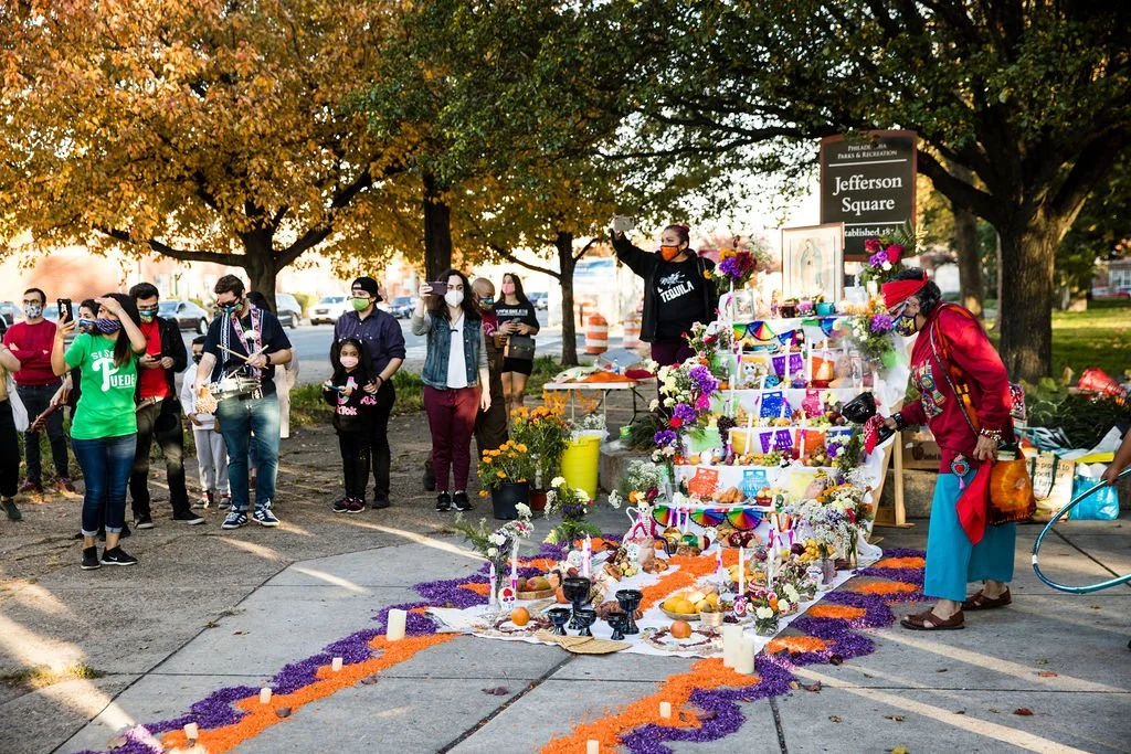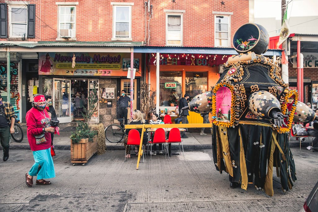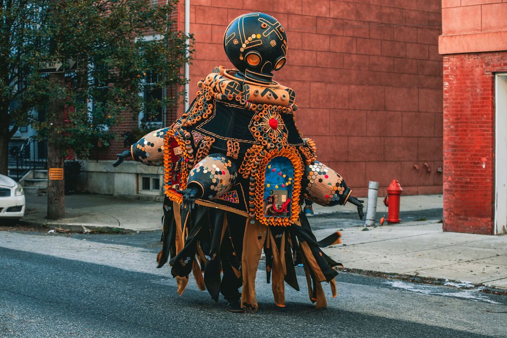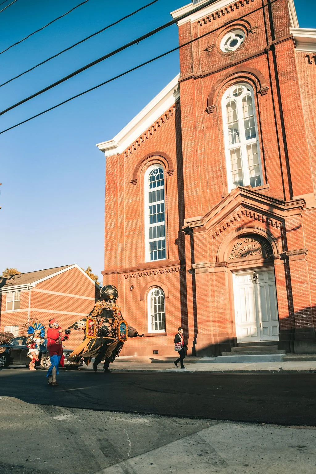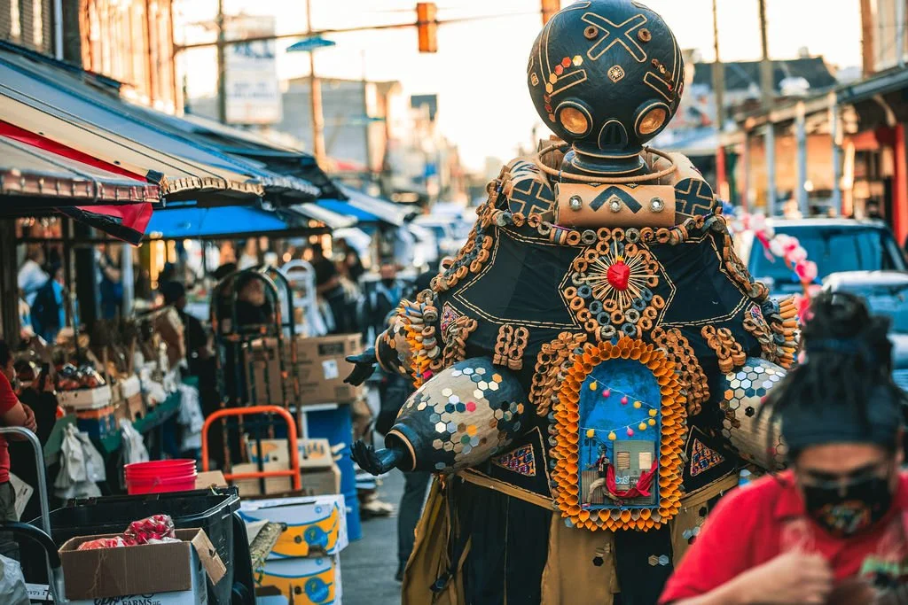 El Vínculo, a ceremonial suit created in 2020. This powerful ensemble served as a public act of care, summoning the spirit of death with compassion and dignity. In the image, we see El Vínculo walking on 9th St. Philadelphia, specifically in the Mexican and Central American market. The suit, along with four altars, was designed to align with the four cardinal points, a practice seen in many indigenous and Caribbean traditions. This intentional design allowed us to involve the entire city in the performance, offering an offering to our loved ones who had transitioned. We extended our reach to neighborhoods in both South and North Philadelphia, recognizing that the offering could no longer be confined to one location. It was important for us to approach people on their own terms, in their own spaces.